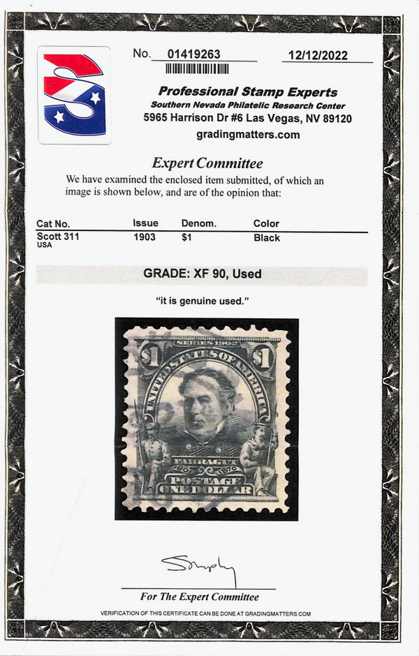 5163 O 311 image1903, $1 black (Scott 311), Extremely Fine, with 2022 P.S.E. certificate graded XF 90.