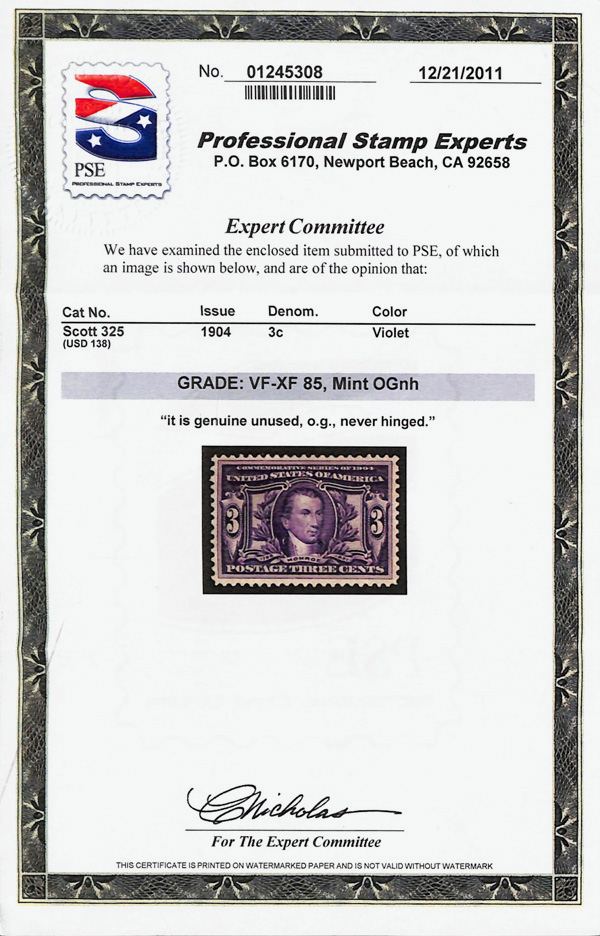 5172 nh 325 image1904, 3¢ Louisiana Purchase (Scott 325), o.g., never hinged, Very Fine to Extremely Fine, with 2011 P.S.E. certificate graded VF-XF 85.