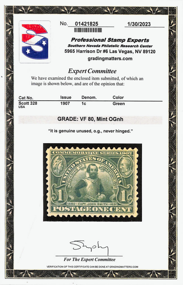5173 nh 328 image1907, 1¢ Jamestown (Scott 328), o.g., never hinged, Very Fine, with 2023 P.S.E. certificate graded VF 80.