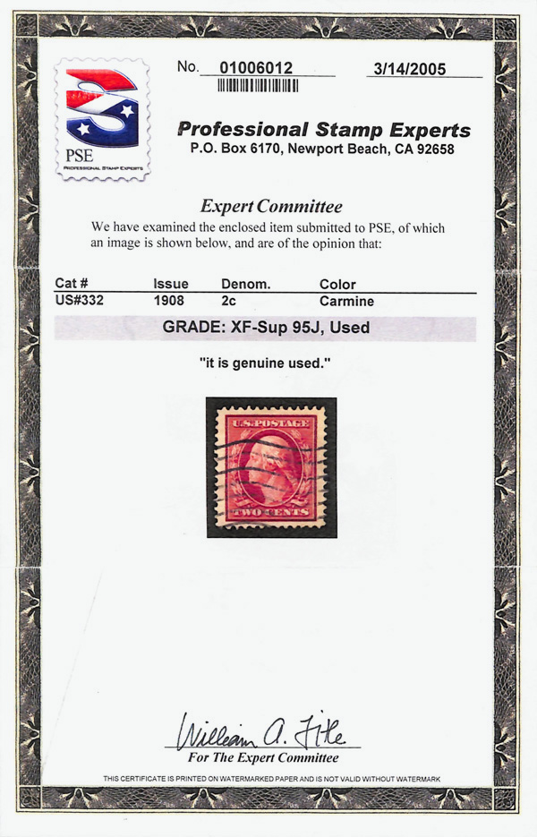 5179 O 332 image1908, 2¢ carmine, D.L. watermark (Scott 332), Extremely Fine to Superb, with 2005 P.S.E. certificate graded XF-SUP 95J.