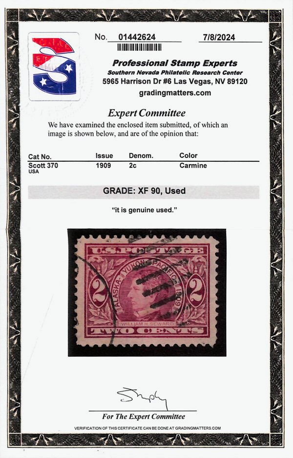 5190 O 370 image1909, 2¢ Alaska-Yukon (Scott 370), Extremely Fine, with 2024 P.S.E. certificate graded XF 90.