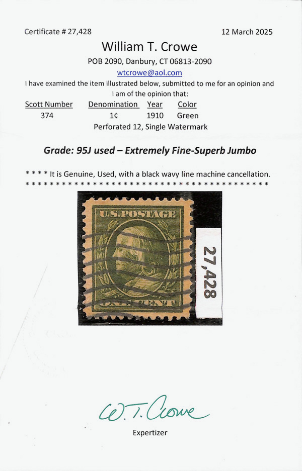 5195 O 374 image1910, 1¢ green, S.L. watermark (Scott 374), Extremely Fine to Superb, with 2025 Crowe certificate graded XF-SUP 95J.