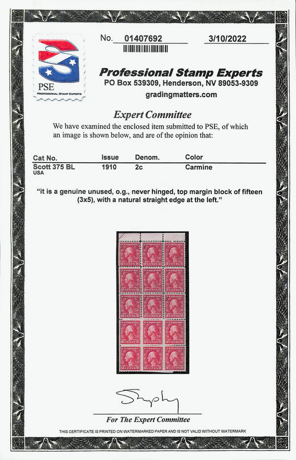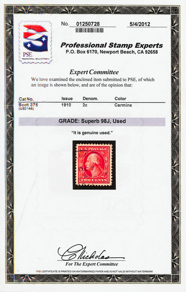 5197 O 375 image1910, 2¢ carmine, S.L. watermark (Scott 375), Superb, with 2012 P.S.E. certificate graded SUP 98J.