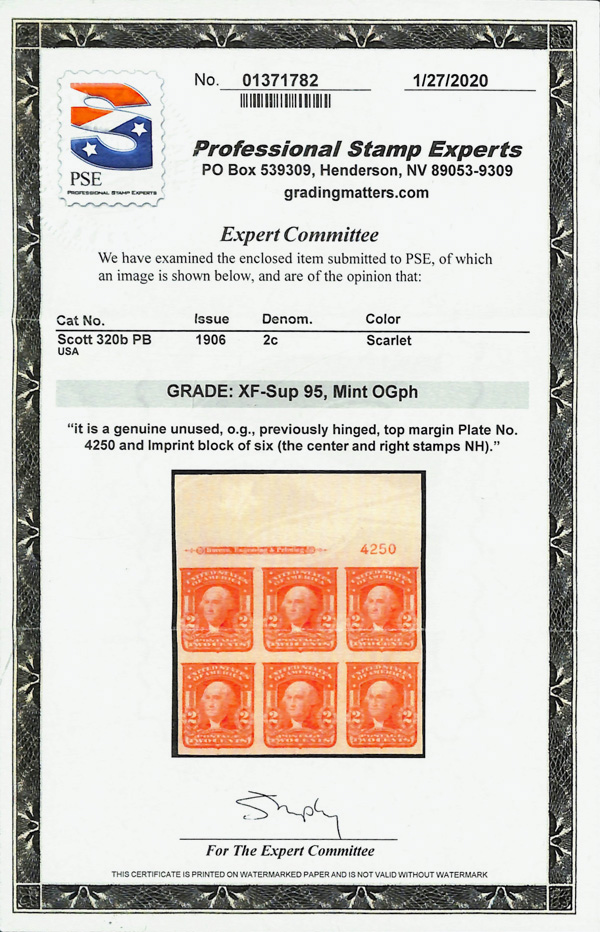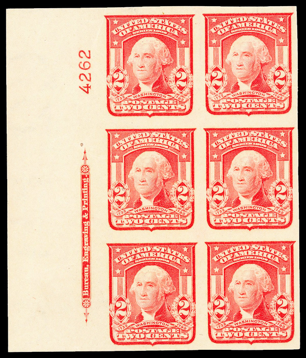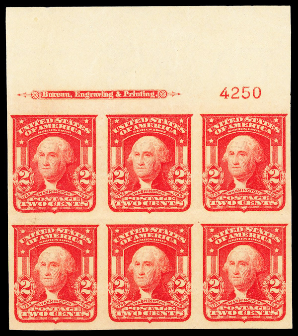 5170 ogbl 320b image1906, 2¢ scarlet, type I, imperf. (Scott 320b), plate block of 6, o.g., barest trace of hinge (appears never hinged), Extremely Fine to Superb, with 2020 P.S.E. certificate graded XF-SUP 95.
