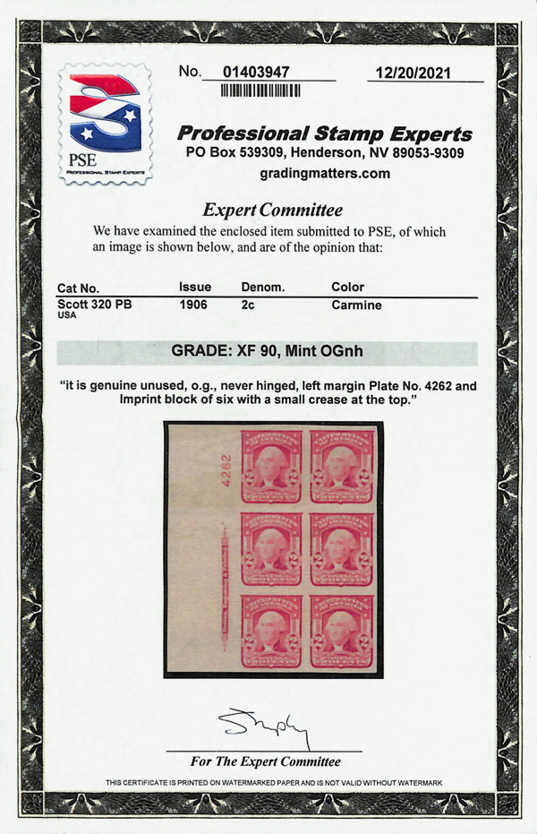 5167 nhbl 320 image1906, 2¢ carmine, type I, imperf. (Scott 320), plate block of 6, o.g., never hinged (minor gum crease), Extremely Fine, with 2021 P.S.E. certificate graded XF 90.