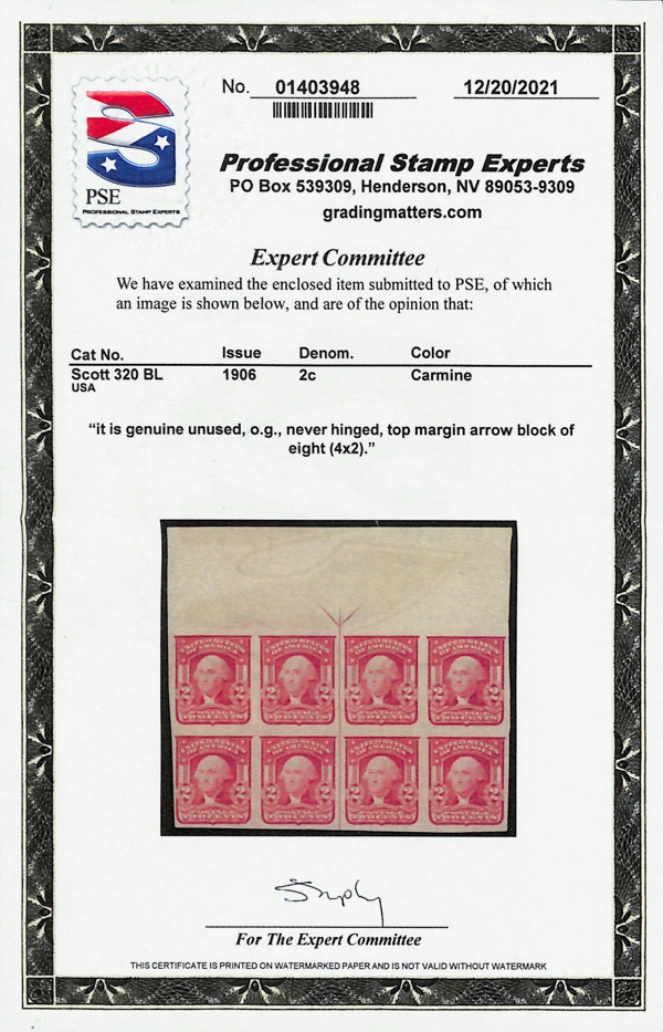 5168 nhbl 320 image1906, 2¢ carmine, type I, imperf. (Scott 320), arrow block of 8, o.g., never hinged, Fine to Very Fine, with 2021 P.S.E. certificate.