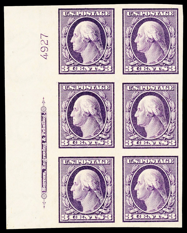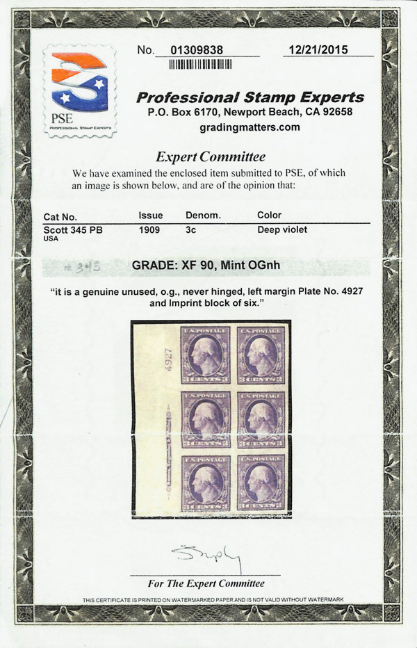 5185 nhbl 345 image1909, 3¢ deep violet, type I, D.L. watermark, imperf. (Scott 345), plate block of 6, o.g., never hinged, Extremely Fine, with 2015 P.S.E. certificate graded XF 90.