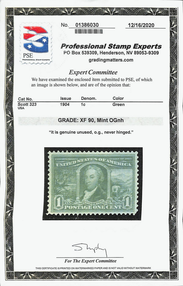 5171 nh 323 image1904, 1¢ Louisiana Purchase (Scott 323), o.g., never hinged, Extremely Fine, with 2020 P.S.E. certificate graded XF 90.