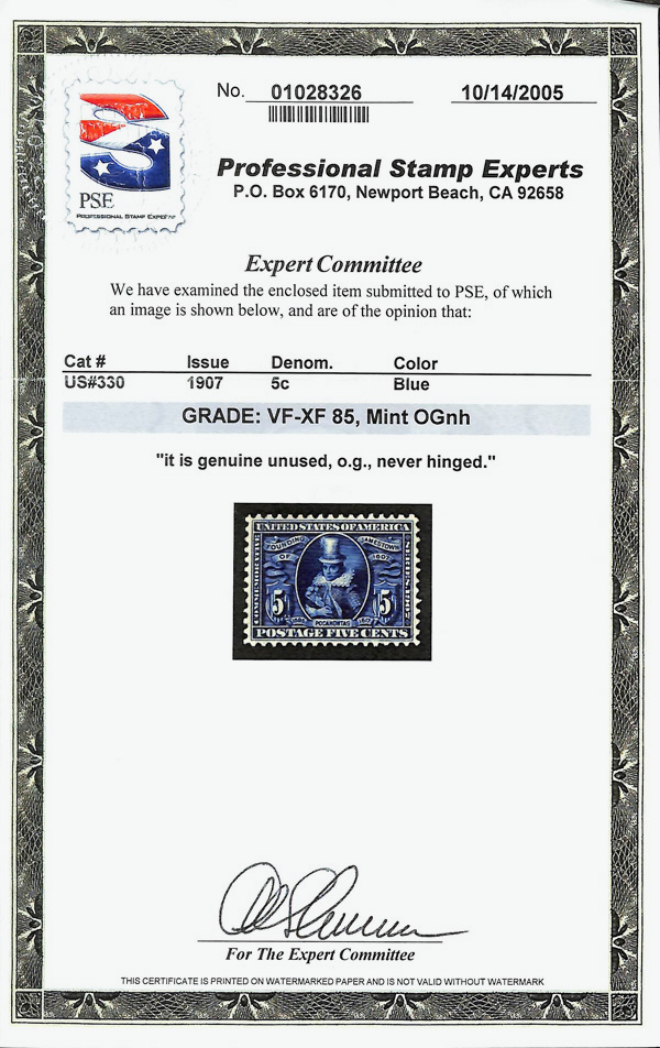 5174 nh 330 image1907, 5¢ Jamestown (Scott 330), o.g., never hinged, Very Fine to Extremely Fine, with 2005 P.S.E. certificate graded VF-XF 85.