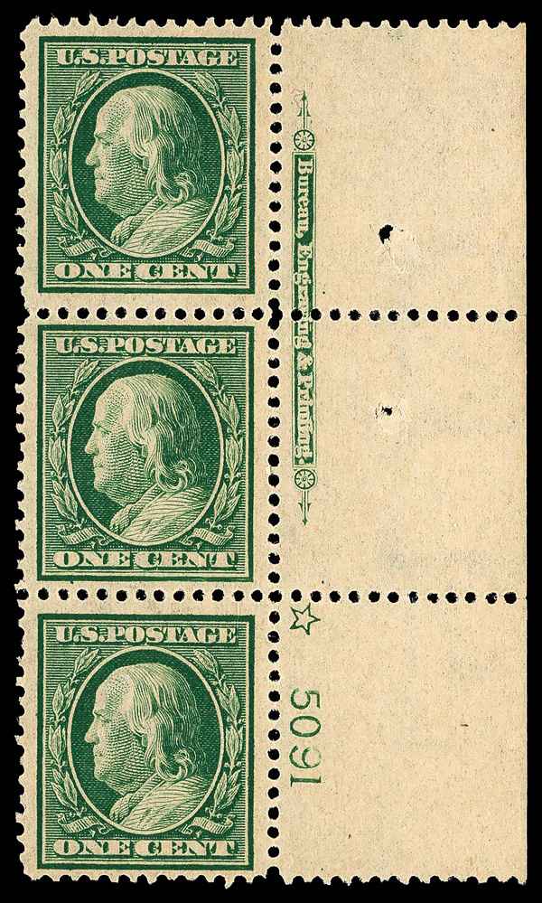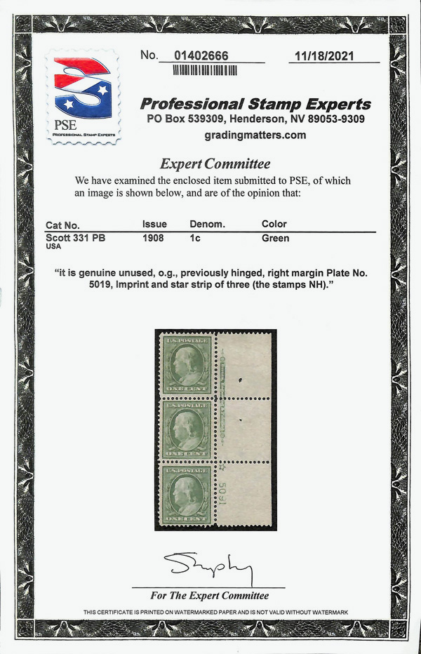 5176 nh/og 331 image1908, 1¢ green, D.L. watermark (Scott 331), imprint and plate number strip of 3, o.g., lightly hinged (2 stamps never hinged), Very Fine, with 2021 P.S.E. certificate.