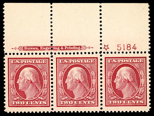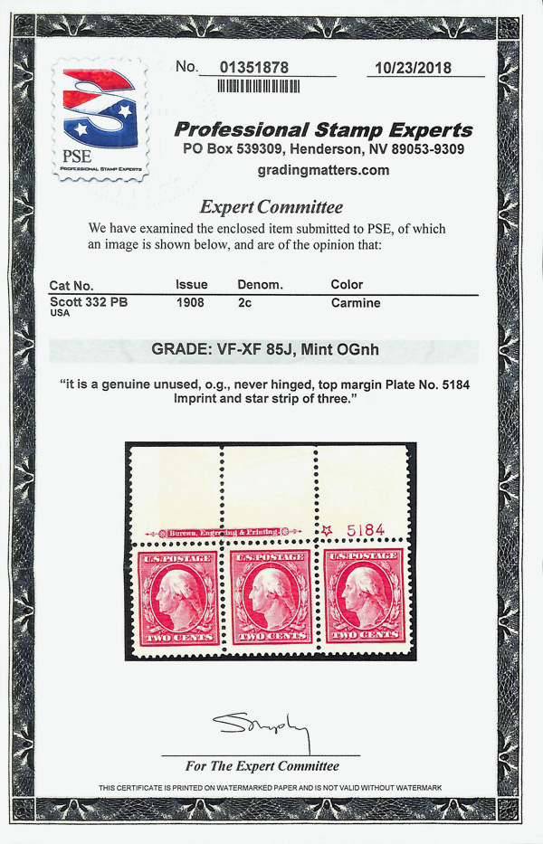 5178 nh 332 image1908, 2¢ carmine, D.L. watermark (Scott 332), imprint, star and plate number strip of 3, o.g., never hinged, jumbo margins, Very Fine to Extremely Fine, with 2018 P.S.E. certificate graded VF-XF 85J. (Image) (Image2) (All Images)