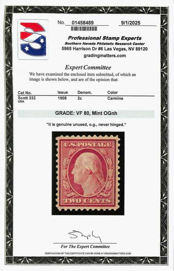 5177 nh 332 image1908, 2¢ carmine, D.L. watermark (Scott 332), o.g., never hinged, Very Fine no SMQ price, with 2025 P.S.E. certificate graded VF 80. (Image) (Image2) (All Images)