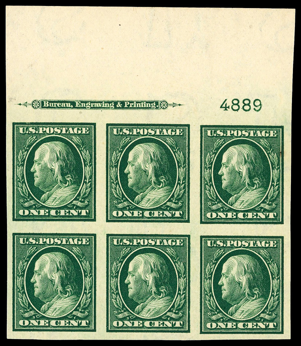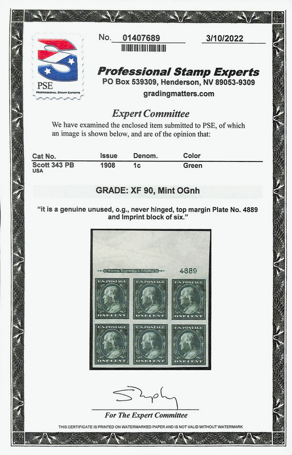 5183 nhbl 343 image1908, 1¢ green, D.L. watermark, imperf. (Scott 343), plate block of 6, o.g., never hinged, Extremely Fine, with 2022 P.S.E. certificate graded XF 90.