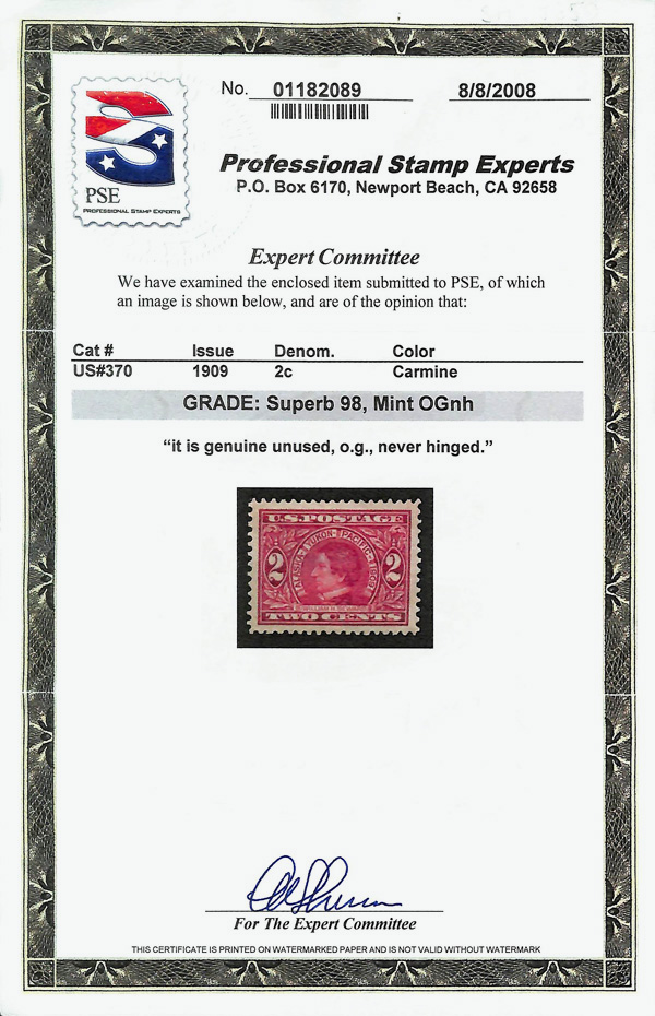 5189 nh 370 image1909, 2¢ Alaska-Yukon (Scott 370), o.g., never hinged, Superb, with 2008 P.S.E. certificate graded SUP 98.