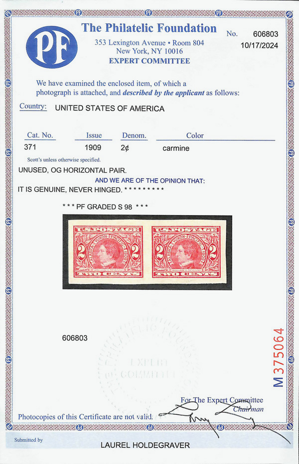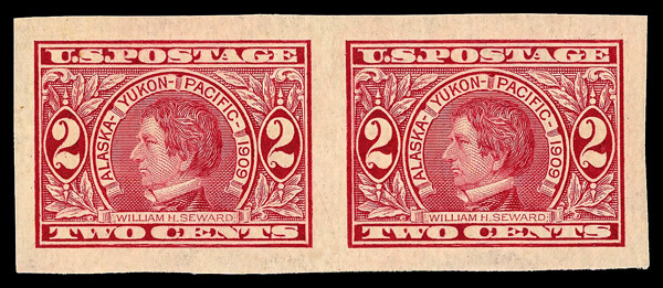 5191 nh 371 image1909, 2¢ Alaska-Yukon, imperf. (Scott 371), pair, o.g., never hinged, Superb no SMQ price, with 2024 P.F. certificate graded SUP 98. (Image) (Image2) (All Images)