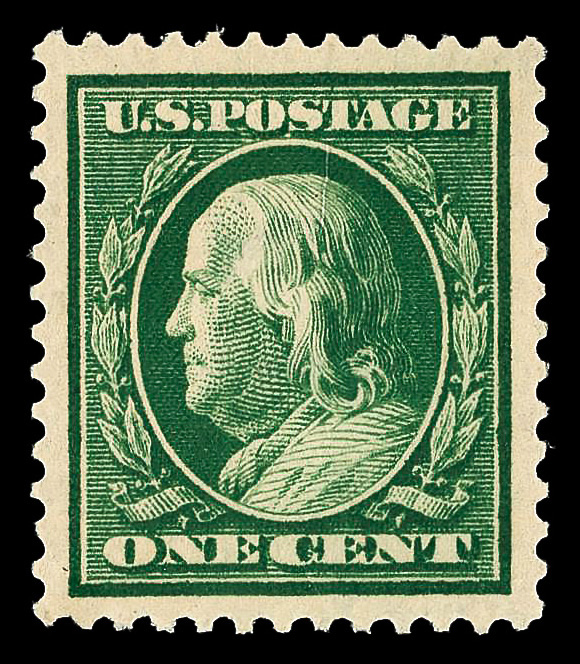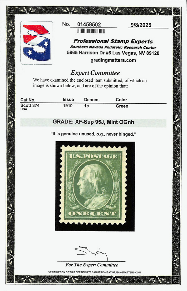 5194 nh 374 image1910, 1¢ green, S.L. watermark (Scott 374), o.g., never hinged, jumbo margins, Extremely Fine to Superb, with 2025 P.S.E. certificate graded XF-SUP 95J.