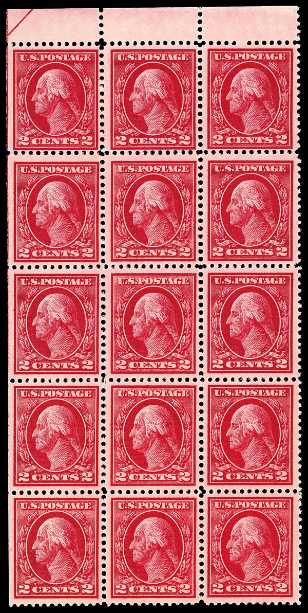 5198 nhbl 375 image1910, 2¢ carmine, S.L. watermark (Scott 375), top left corner margin block of 4 with arrow, o.g., never hinged, Fine to Very Fine.