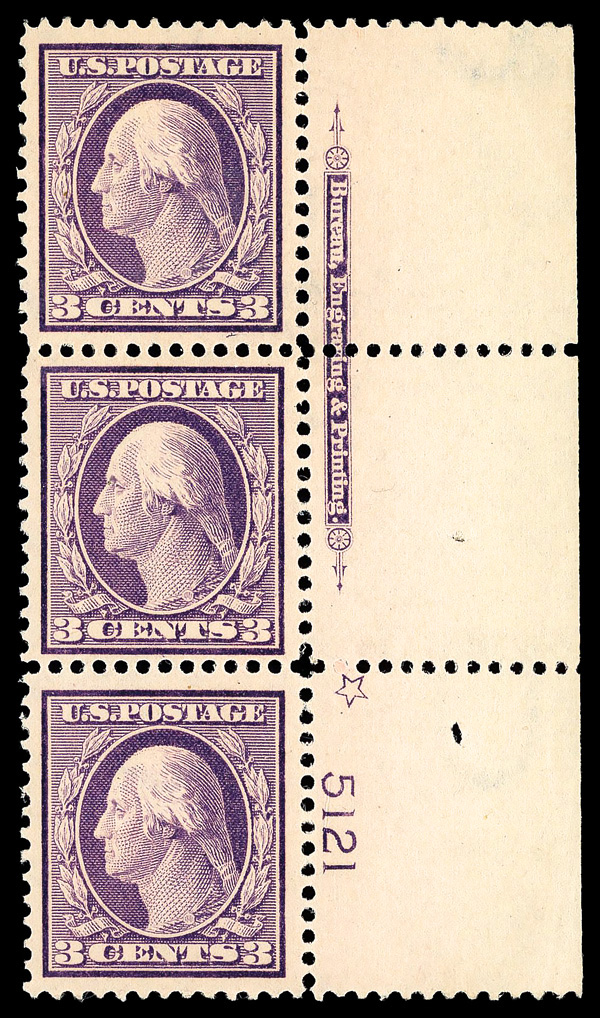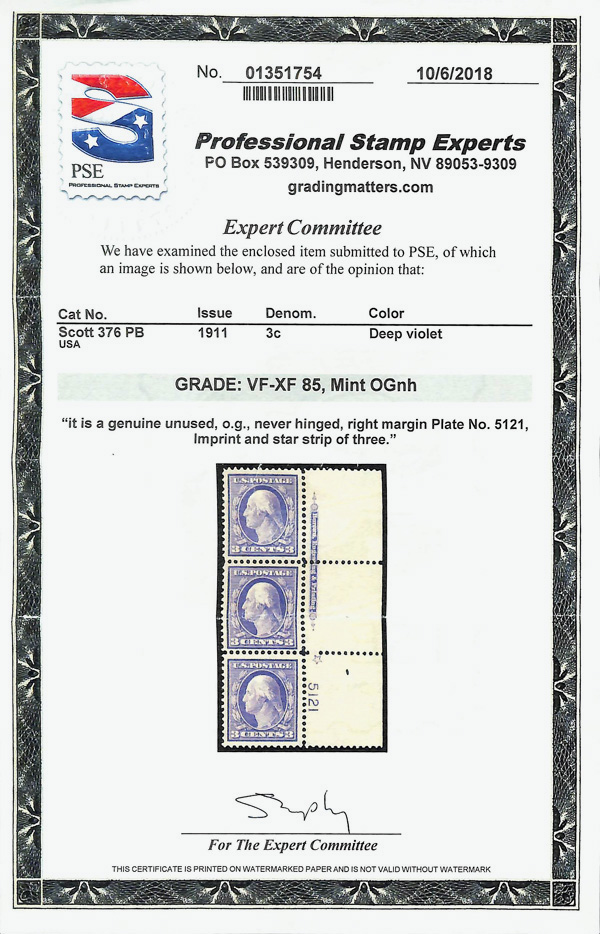 5199 nh 376 image1911, 3¢ deep violet, type I, S.L. watermark (Scott 376), imprint, star and plate number strip of 3, o.g., never hinged, Very Fine to Extremely Fine, with 2018 P.S.E. certificate graded VF-XF 85.