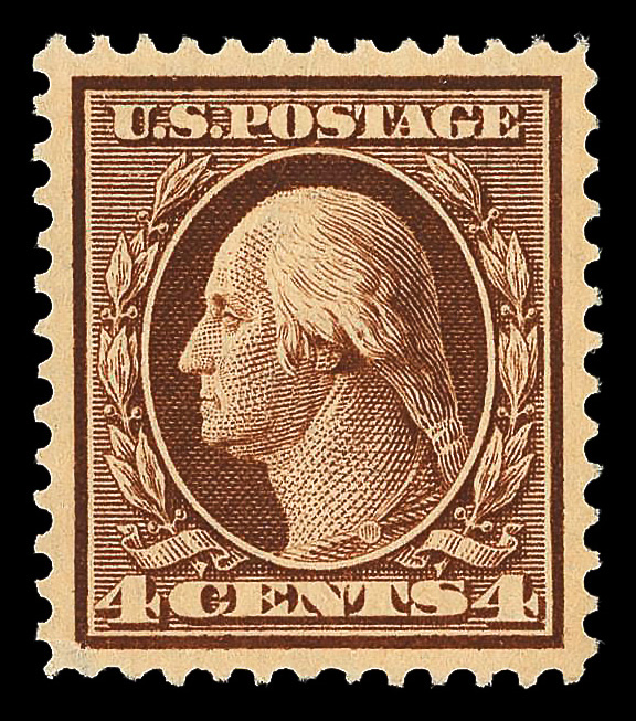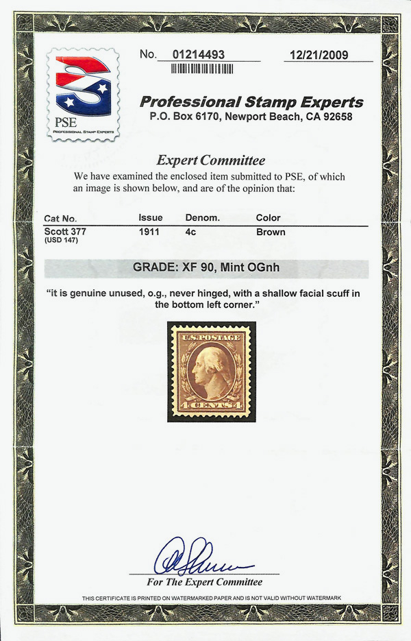 5200 nh 377 image1911, 4¢ brown, S.L. watermark (Scott 377), o.g., never hinged; tiny facial scuff LL, Extremely Fine, with 2009 P.S.E. certificate graded XF 90.