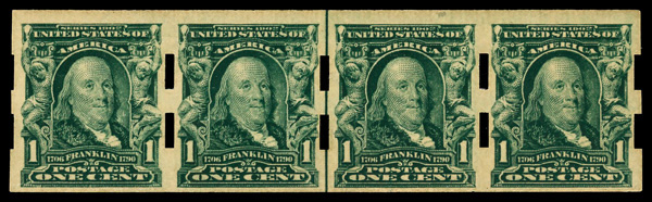 5164 og 314 image1906, 1¢ blue green, imperf. (Scott 314), guide line strip of 4, Schermack type III private vending perfs, o.g., lightly hinged, Fine, with 2020 P.S.E. certificate.