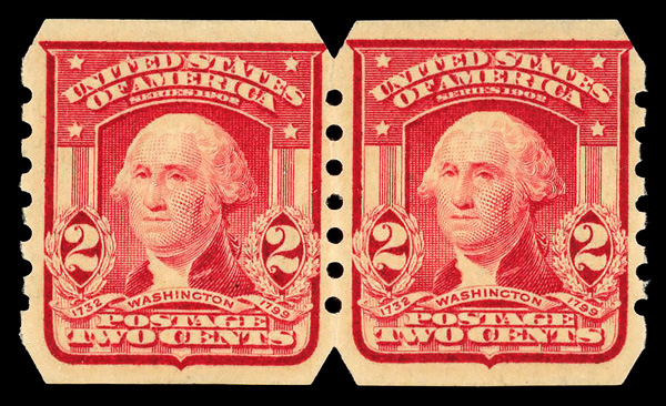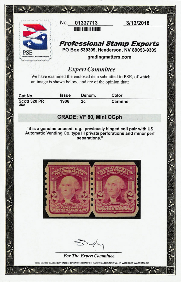5166 nh 320 image1906, 2¢ carmine, type I, imperf. (Scott 320), pair (minor perf separations), U.S. Automatic Vending Co. type III private vending perfs, o.g., never hinged, Very Fine, with 2018 P.S.E. certificate graded VF 80.
