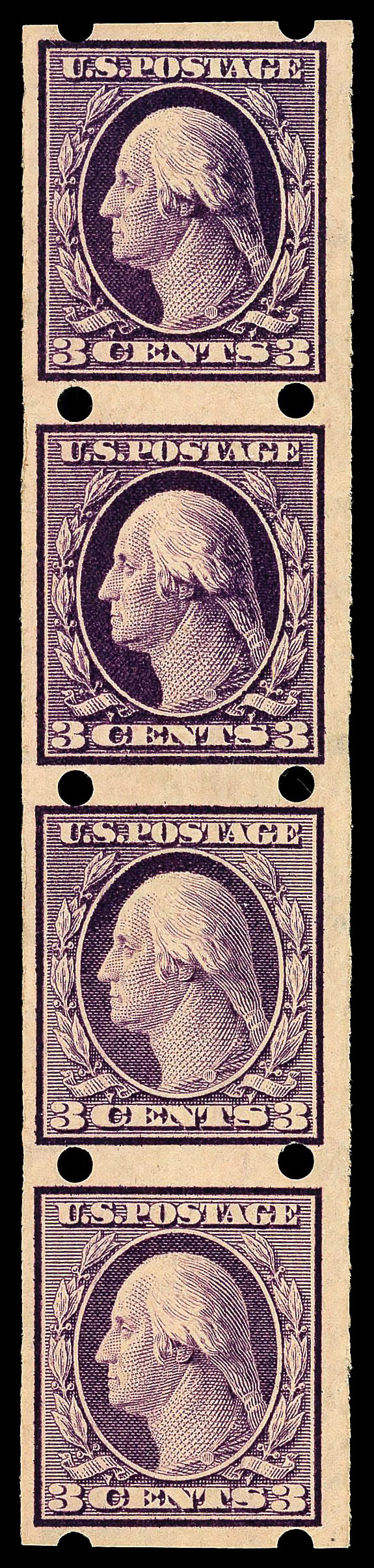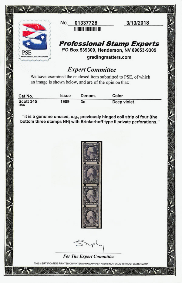 5184 nh/og 345 image1909, 3¢ deep violet, type I, D.L. watermark, imperf. (Scott 345), strip of 4, Brinkerhoff type II private vending perfs, o.g., lightly hinged (3 stamps never hinged), Very Fine, with 2018 P.S.E. certificate.