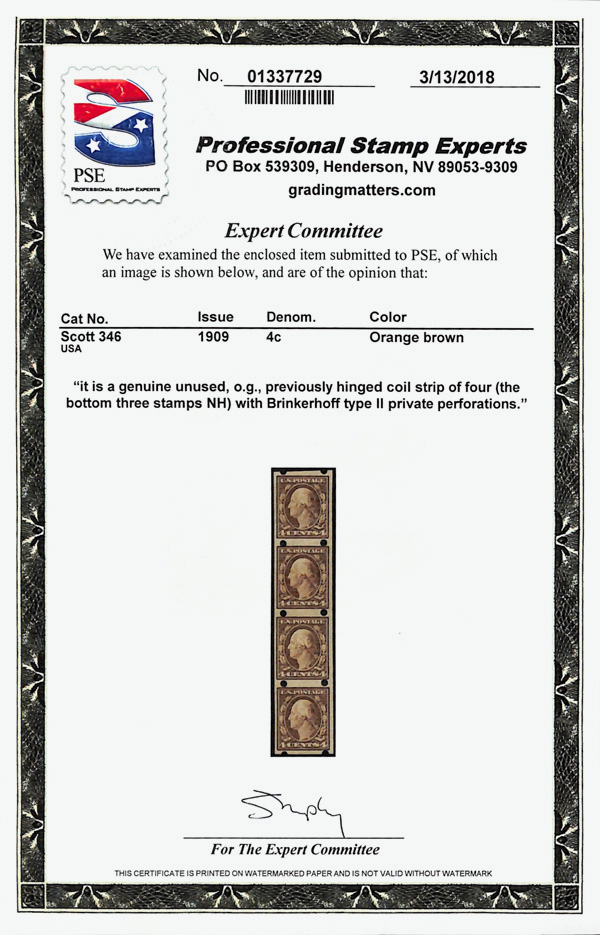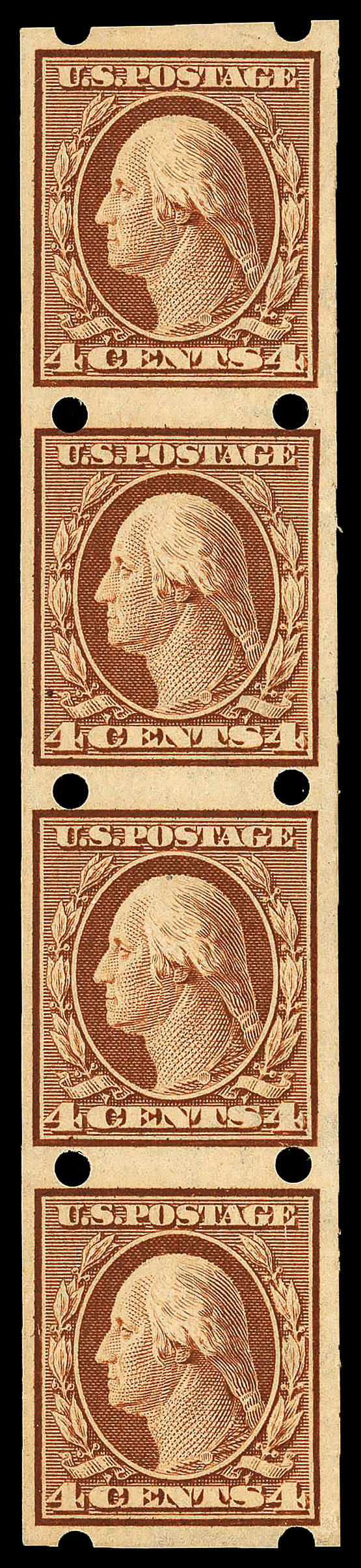 5186 nh/og 346 image1909, 4¢ orange brown, D.L. watermark, imperf. (Scott 346), strip of 4, Brinkerhoff type II private vending perfs, o.g., lightly hinged (3 stamps never hinged), Fine to Very Fine, with 2018 P.S.E. certificate.