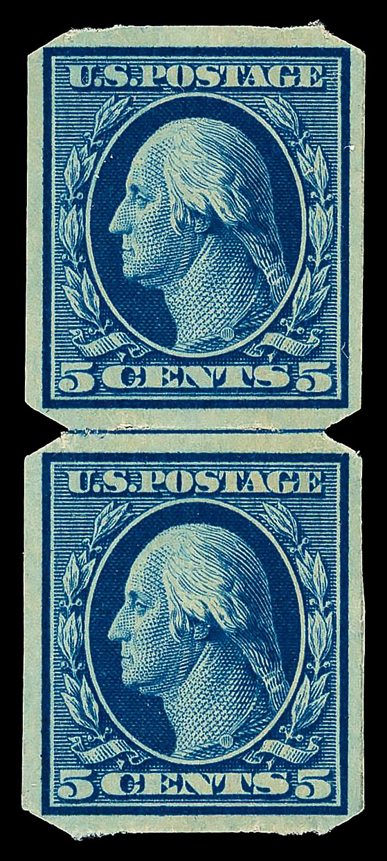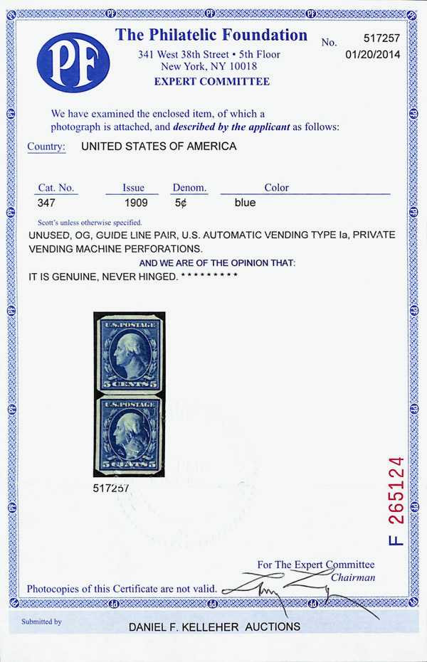 5187 og 347 image1909, 5¢ blue, D.L. watermark, imperf. (Scott 347), guide line pair, U.S. Automatic Vending Co. Type Ia private vending perfs, o.g., very lightly hinged, Very Fine, with 2014 P.F. certificate.