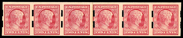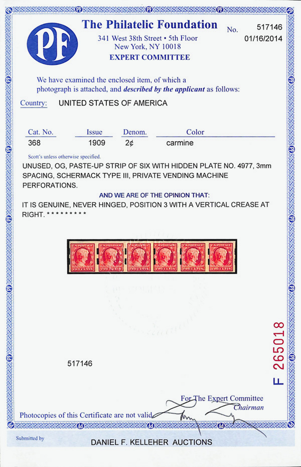 5188 nh 368 image1909, 2¢ Lincoln Centenary, imperf. (Scott 368), paste up strip of 6 (3mm spacing), Schermack Type III private vending perfs with plate number under paste up., o.g., never hinged, Fine, with 2014 P.F. certificate.