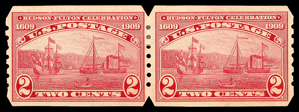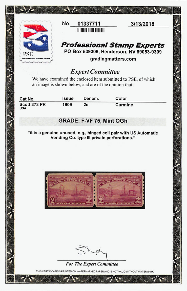 5192 og 373 image1909, 2¢ Hudson-Fulton, imperf. (Scott 373), pair, U.S. Automatic Vending Co. Type III private vending perfs, o.g., hinge remnant, Fine to Very Fine, with 2018 P.S.E. certificate graded F-VF 75.