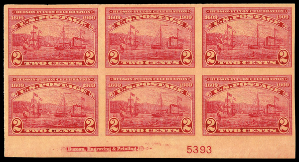 5193 nhbl 373 image1909, 2¢ Hudson-Fulton, imperf. (Scott 373), bottom margin plate block of 6 with plate number 5393, Deep tone with lively brightness, o.g., never hinged; light wrinkle on top right stamp, Very Fine to Extremely Fine.