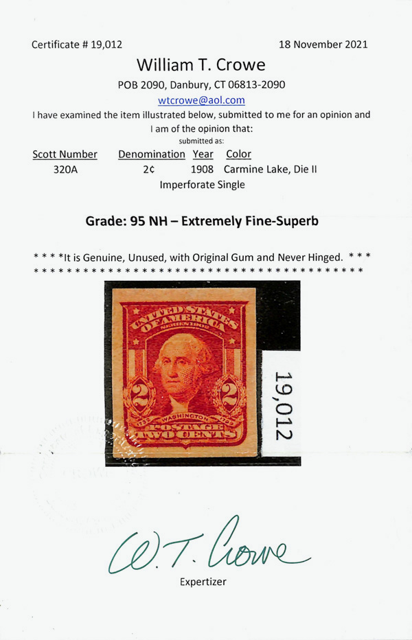 5169 nh 320A image1906, 2¢ lake, type II, imperf. (Scott 320A), o.g., never hinged, a lovely stamp with immense color depth and full, balanced margins all around, Extremely Fine to Superb, with 2021 Crowe certificate graded XF-SUP 95.