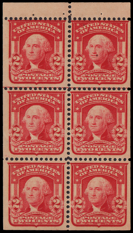 5165 BKnh 319Fq image1903, 2¢ lake, type II, booklet pane of 6 (Scott 319Fq), position E, an immaculate, o.g., never hinged, solid and well centered, Very Fine, includes an interleaf from the original booklet.