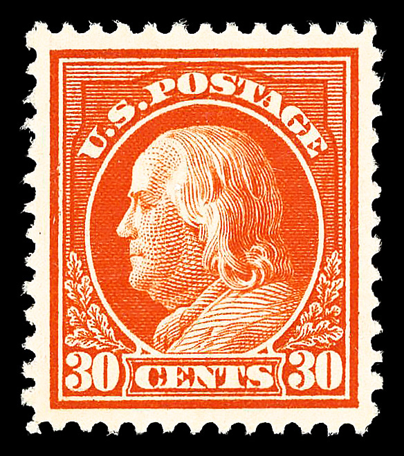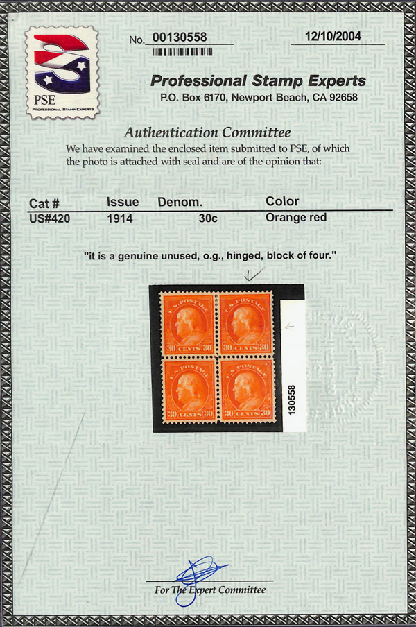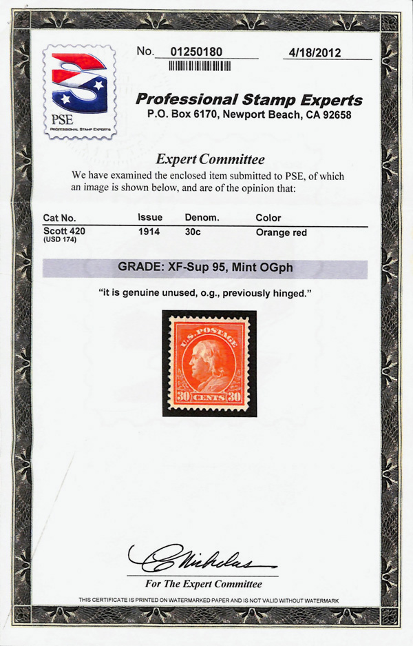 5241 og 420 image1914, 30¢ orange red, S.L. watermark, perf. 12 (Scott 420), o.g., lightly hinged, Extremely Fine to Superb, with 2012 P.S.E. certificate graded XF-SUP 95 & 2004 P.S.E. cerificate.
