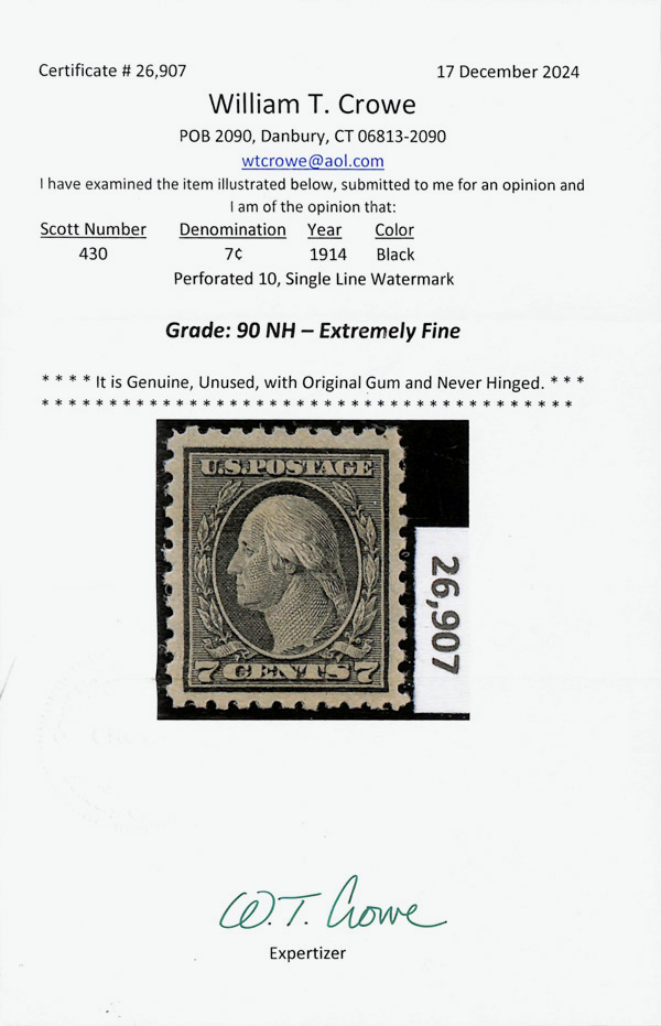 5244 nh 430 image1914, 7¢ black, S.L. watermark, perf. 10 (Scott 430), o.g., never hinged, Extremely Fine, with 2024 Crowe certificate graded XF 90.