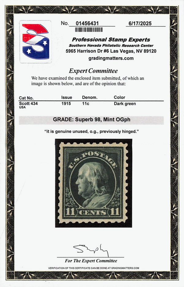 5246 og 434 image1915, 11¢ dark green, S.L. watermark, perf. 10 (Scott 434), o.g., very lightly hinged, Superb, with 2025 P.S.E. certificate graded SUP 98.