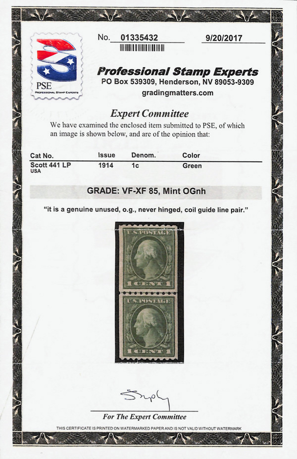 5247 nh 441 image1914, 1¢ green, S.L. watermark, flat plate coil, perf. 10 horizontally (Scott 441), guide line pair, o.g., never hinged, Very Fine to Extremely Fine, with 2017 P.S.E. certificate graded VF-XF 85.