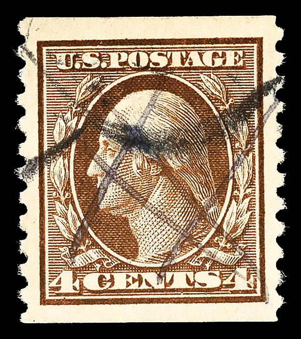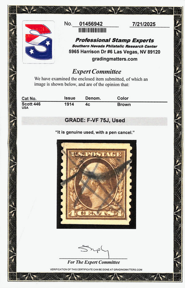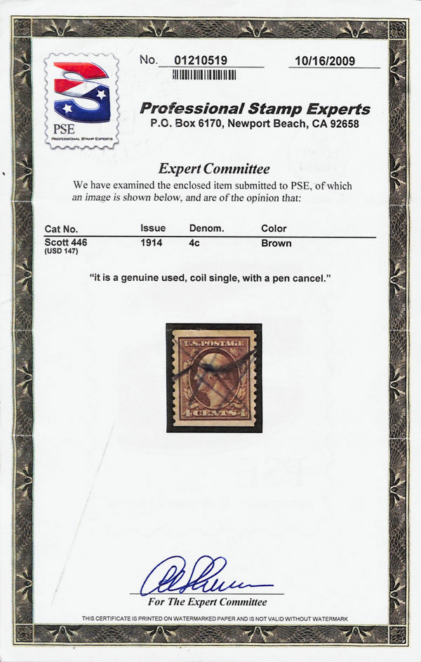 5248 O 446 image1914, 4¢ brown, S.L. watermark, flat plate coil, perf. 10 vertically (Scott 446), jumbo margins, Fine to Very Fine no SMQ price, with 2025 P.S.E. certificate graded F-VF 75J & 2009 P.S.E. certificate. (Image) (Image2) (Image3) (All Images)