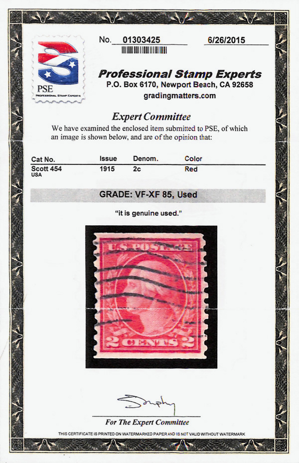 5251 O 454 image1915, 2¢ red, type II, S.L. watermark, rotary press coil, perf. 10 vertically (Scott 454), Very Fine to Extremely Fine, with 2015 P.S.E. certificate graded VF-XF 85.