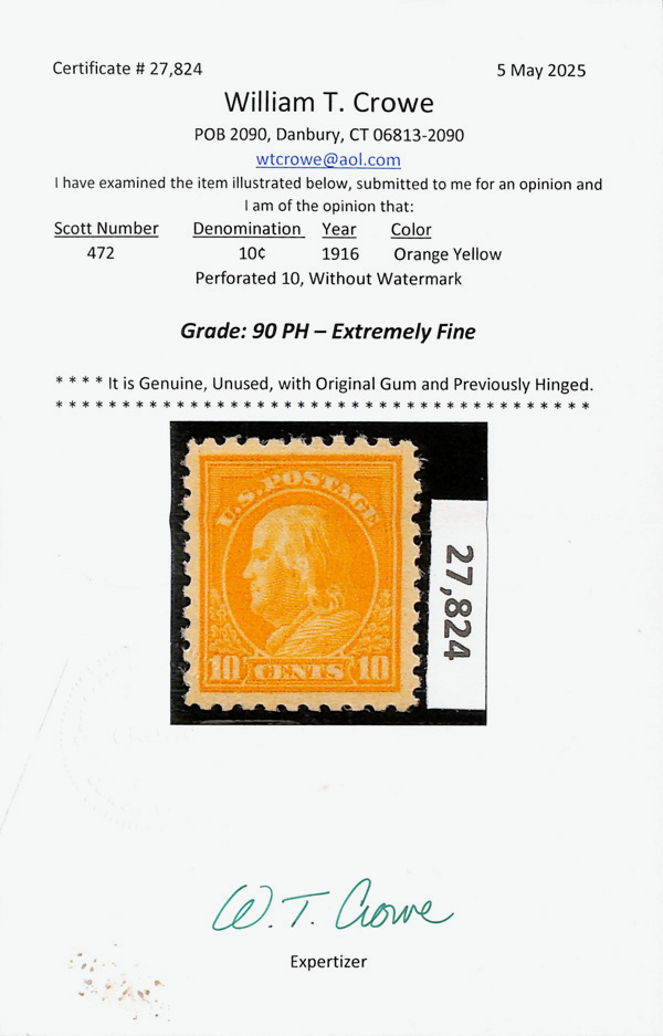 5258 og 472 image1916, 10¢ orange yellow, unwatermarked, perf. 10 (Scott 472), o.g., lightly hinged, Extremely Fine, with 2025 Crowe certificate graded XF 90.