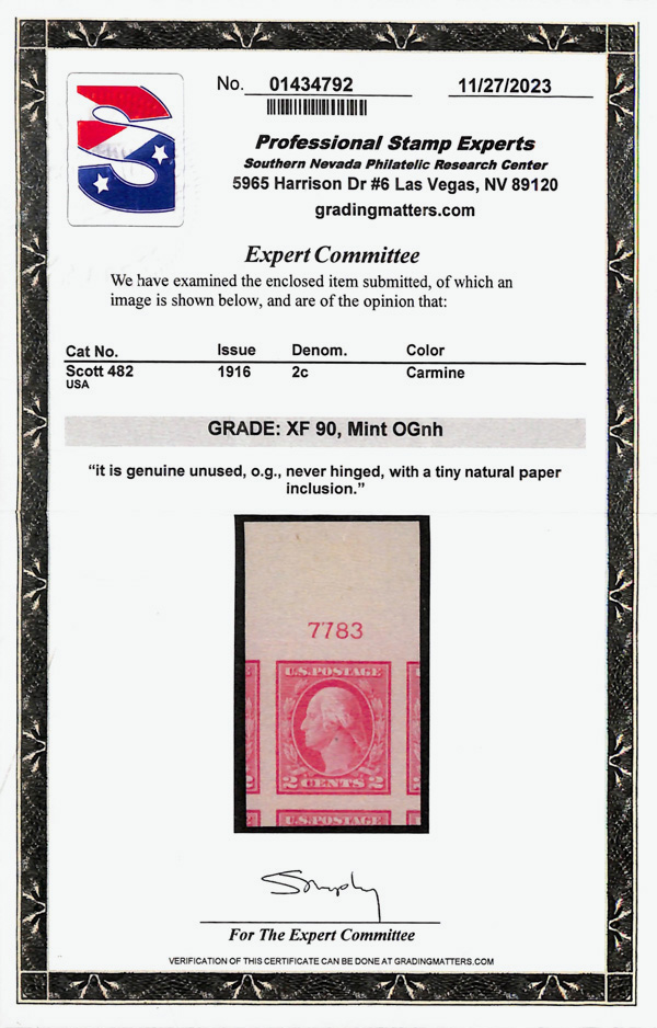 5263 nh 482 image1916, 2¢ carmine, type I, unwatermarked, imperf. (Scott 482), plate number single, o.g., never hinged (paper inclusion), Extremely Fine, with 2023 P.S.E. certificate graded XF 90.