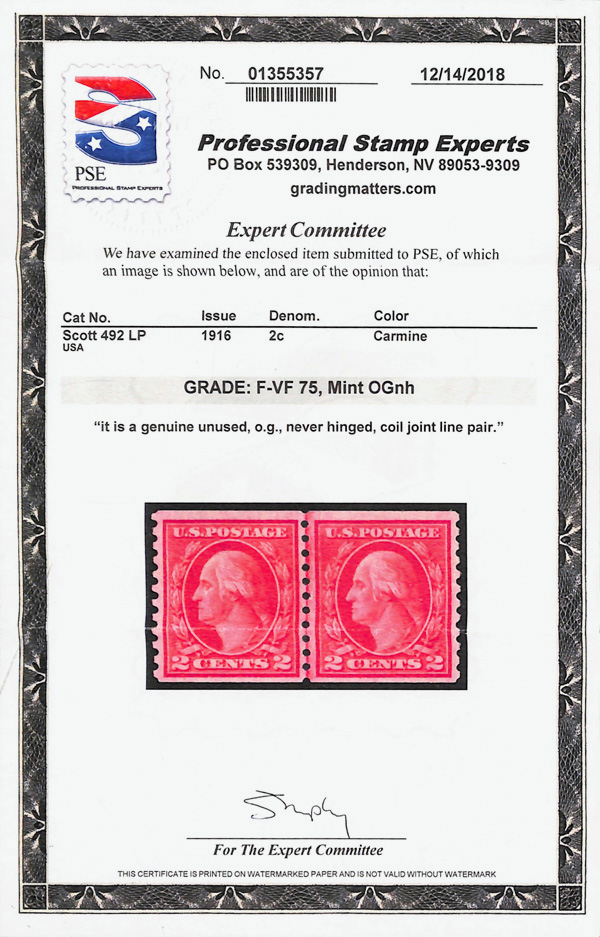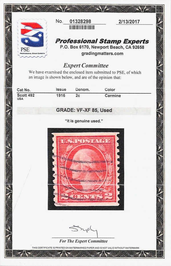 5271 O 492 image1916, 2¢ carmine, type III, unwatermarked, rotary press coil, perf. 10 vertically (Scott 492), Very Fine to Extremely Fine, with 2017 P.S.E. certificate graded VF-XF 85.