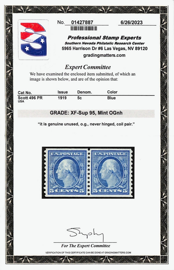 5277 nh 496 image1919, 5¢ blue, unwatermarked, rotary press coil, perf. 10 vertically (Scott 496), pair, o.g., never hinged, Extremely Fine to Superb, with 2023 P.S.E. certificate graded XF-SUP 95.