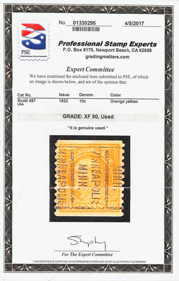5279 O 497 image1922, 10¢ orange yellow, unwatermarked, rotary press coil, perf. 10 vertically (Scott 497), Extremely Fine, with 2017 P.S.E. certificate graded XF 90.