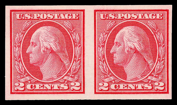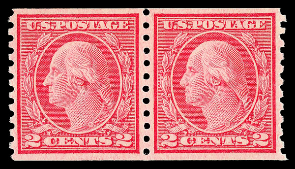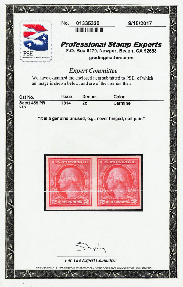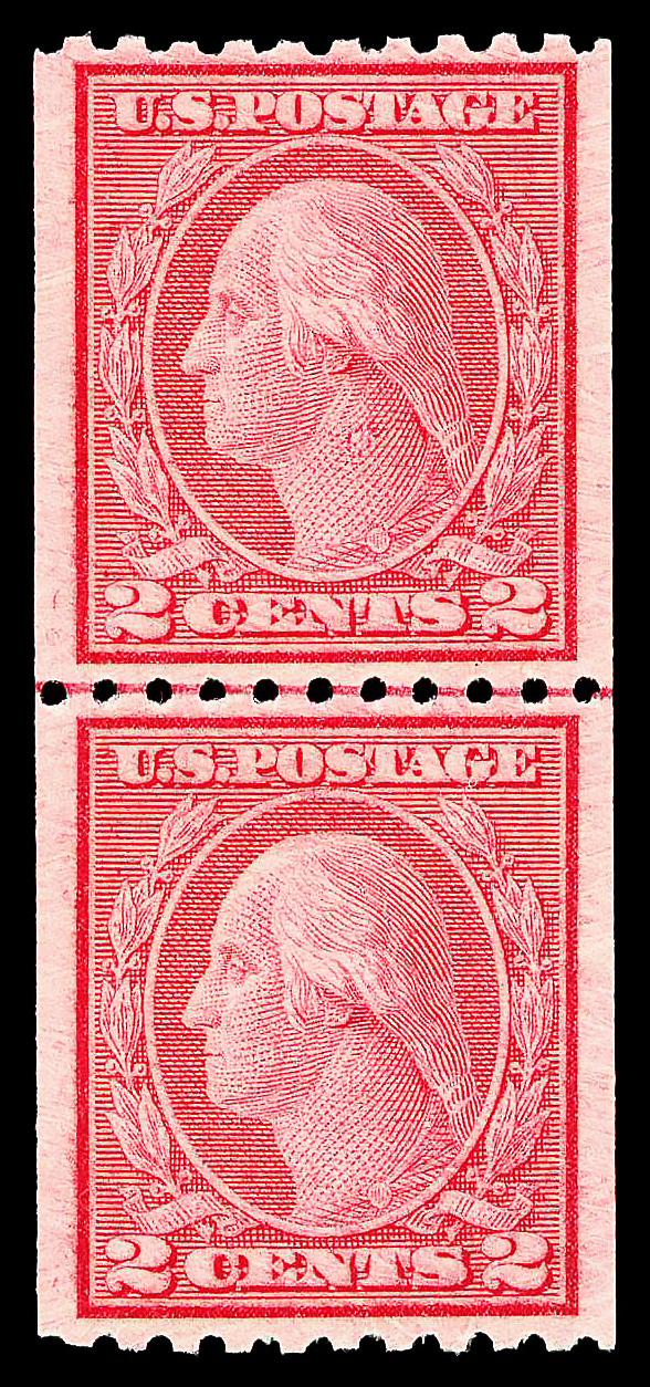 5254 nh 459 image1914, 2¢ carmine, type I, S.L. watermark, imperf. horizontal coil (Scott 459), pair, o.g., never hinged, Very Fine, with 2017 P.S.E. certificate.