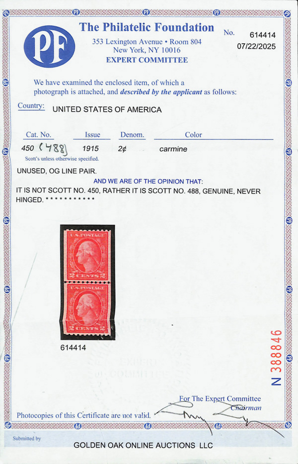 5268 nh 488 image1919, 2¢ carmine, type III, unwatermarked, rotary press coil, perf. 10 horizontally (Scott 488), joint line pair, o.g., never hinged, Fine to Very Fine, with 2025 P.F. certificate.