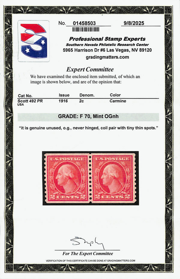 5269 nh 492 image1916, 2¢ carmine, type III, unwatermarked, rotary press coil, perf. 10 vertically (Scott 492), pair, o.g., never hinged; tiny thins, Extremely Fine, with 2025 P.S.E. certificate graded F 70. (Image) (Image2) (All Images)
