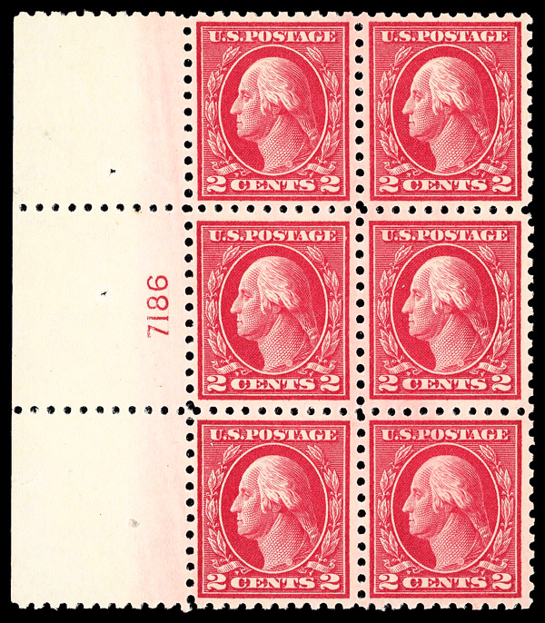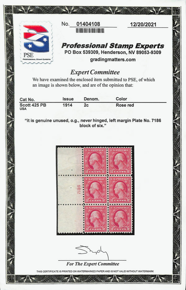 5242 nhbl 425 image1914, 2¢ rose red, type I, S.L. watermark, perf. 10 (Scott 425), plate block of 6, o.g., never hinged, Fine to Very Fine, with 2021 P.S.E. certificate.