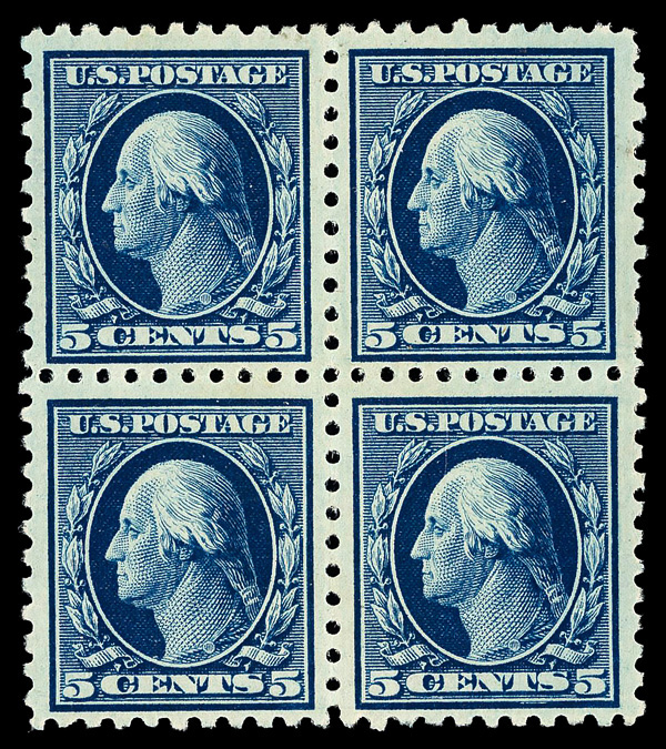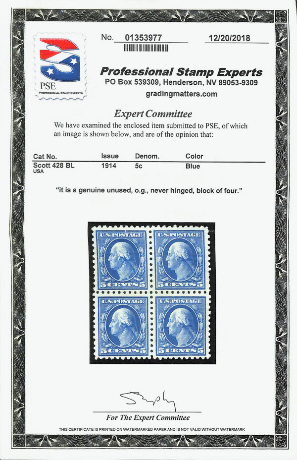 5243 nhbl 428 image1914, 5¢ blue, S.L. watermark, perf. 10 (Scott 428), block of 4, o.g., never hinged, Fine to Very Fine, with 2018 P.S.E. certificate.
