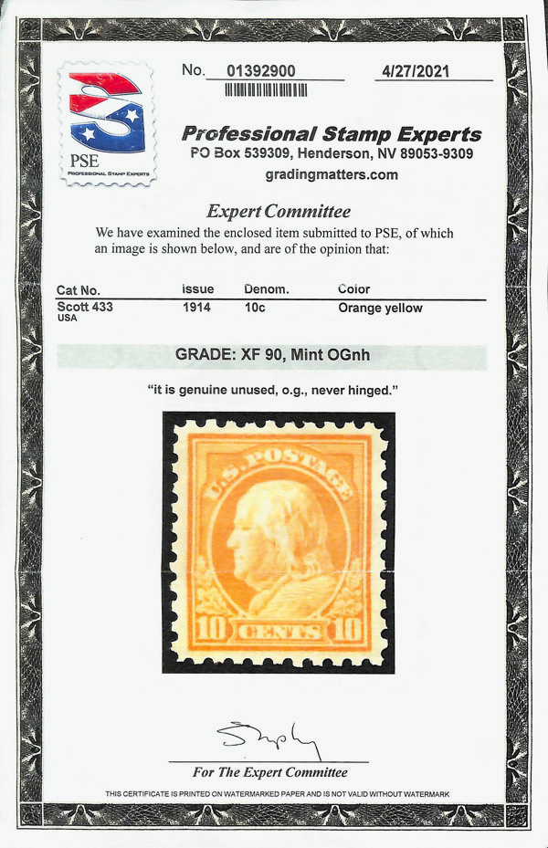 5245 nh 433 image1914, 10¢ orange yellow, S.L. watermark, perf. 10 (Scott 433), o.g., never hinged, Extremely Fine, with 2021 P.S.E. certificate graded XF 90.